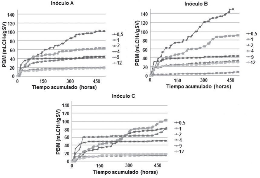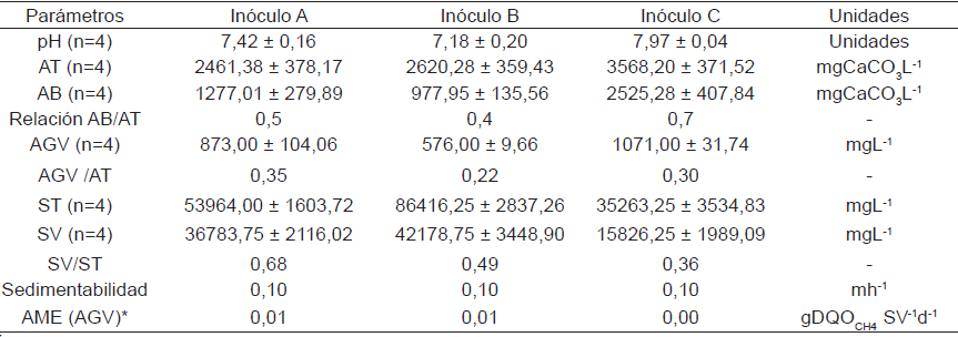Teniendo en cuenta que uno de los inóculos con mayor disponibilidad en el país son los lodos anaerobios procedentes de plantas de tratamiento de aguas residuales municipales (PTAR), se evaluaron los de dos reactores UASB que tratan aguas residuales de localidades con menos de 30000 habitantes (denominados Inóculos A y B) y los de un digestor anaerobio de lodos de una PTAR que utiliza Tratamiento Primario Avanzado (TPA) con FeCl3 (Inóculo C). Las tres localidades presentan sistemas de alcantarillado combinado. A los tres inóculos se les realizó la caracterización fisicoquímica en términos de pH, AT, AB, AGV´s, ST, SV, sedimentabilidad y AME (gDQO gSV-1d-1)[9].