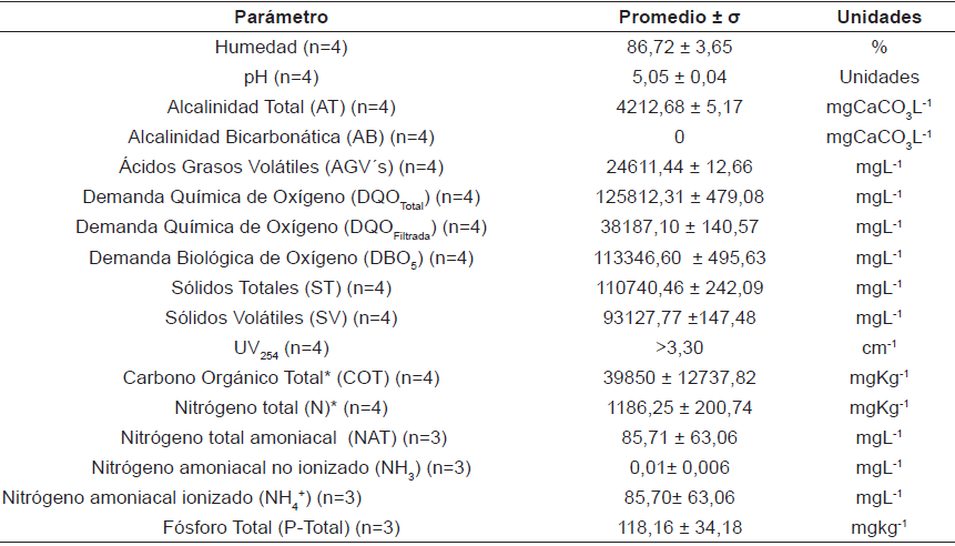 El sustrato (BOM) procedió de un restaurante universitario que atiende a más de 3000 estudiantes al día y genera 2,4t/semana, los cuales estaban constituidos en un 37% por carbohidratos (cáscaras de plátano, papa, entre otros), 31% por fibra y mezcla de minerales (cáscaras de huevo, apio, hierbas, entre otros), 14,5% por frutas no cítricas y 9% por frutas cítricas y semicítricas, respectivamente. Éstos fueron caracterizados de acuerdo a ICONTEC [7] y APHA [8] en términos de Humedad (%), pH (UND), Alcalinidad total (AT) y bicarbonática (AB) (mgCaCO3L-1), Ácidos grasos volátiles (AGV´s) (mgL-1), Demanda Química de Oxígeno (DQOtotal; DQOfiltrada) (mgO2L-1,), Demanda Bioquímica de Oxígeno (DBO5) (mgO2L-1), Sólidos totales (ST) y volátiles (SV) (mgL-1), UV254 (cm-1), Carbono orgánico total, (COT) (mgkg-1), Nitrógeno total (mgkg-1), Nitrógeno amoniacal total (mgL-1), Nitrógeno amoniacal total no ionizado e ionizado(mgL-1) y Fósforo total (mgkg-1).