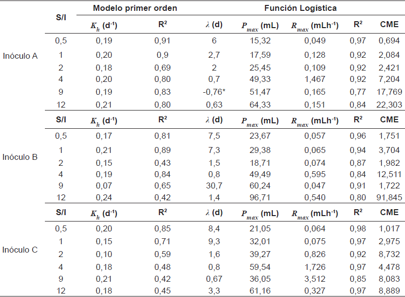 Se observa que a medida que se incrementa la relación S/I, se reduce la tasa de hidrólisis (Kh) para cada uno de los inóculos. La fase de latencia indica el periodo en el cual los microorganismos se adaptan al sustrato [34]; en este estudio estuvo entre 0,7 y 30,7 días para todos los inóculos, siendo los períodos más cortos y los de las mejores Kh con correlaciones fuertes y CME bajo, los asociados al Inóculo C, lo cual puede atribuirse a la mayor capacidad buffer que presentó.