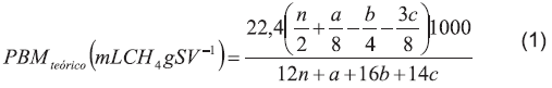 El PBM se expresa generalmente en mLCH4 gSV-1 y se puede determinar de forma teórica o experimental, en el primer caso se emplea la Ecuación de Buswell (Ecuación 1), que considera la composición elemental del sustrato.