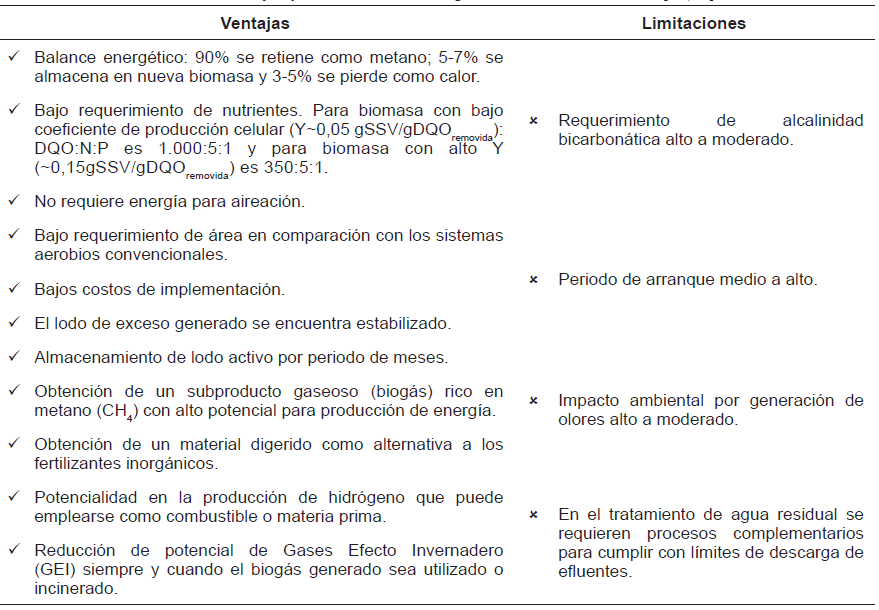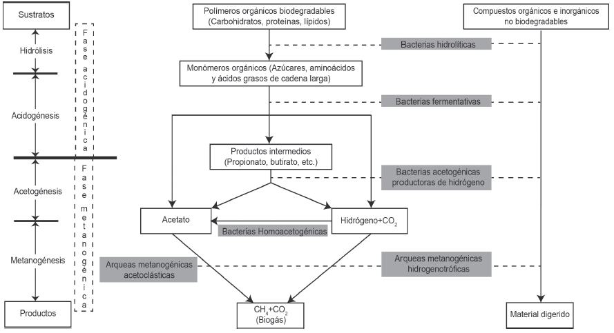 La digestión anaerobia (DA) es un proceso bioquímico realizado por la acción conjunta de varios grupos de microorganismos encargados de transformar bajo condiciones de ausencia de oxígeno molecular, material orgánico complejo como carbohidratos, proteínas y lípidos en moléculas de menor peso como los azúcares, aminoácidos y ácidos grasos volátiles (AGV´s) que son solubles en agua. Como producto final se obtiene biogás compuesto principalmente por metano y dióxido de carbono, además de un material digerido que puede ser sólido o líquido [8]. El proceso de DA ocurre en cuatro etapas consecutivas como se muestra en la Figura 1 y en la Tabla 1 se presentan algunas de las ventajas y limitaciones del proceso.