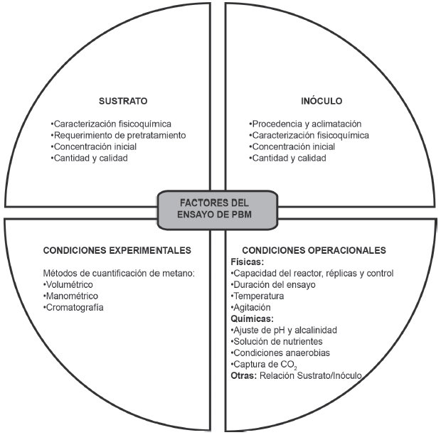 En el ensayo de PBM influyen diferentes factores que pueden agruparse en cuatro grandes grupos: los relacionados con el sustrato, con el inóculo, con las condiciones operacionales y con las experimentales (Figura 2), los cuales es recomendable reportar en cada ensayo con el fin de verificar la posibilidad de comparación con otros estudios y resultados reportados y al mismo tiempo, para aportar a la unificación de protocolos y procedimientos del ensayo.