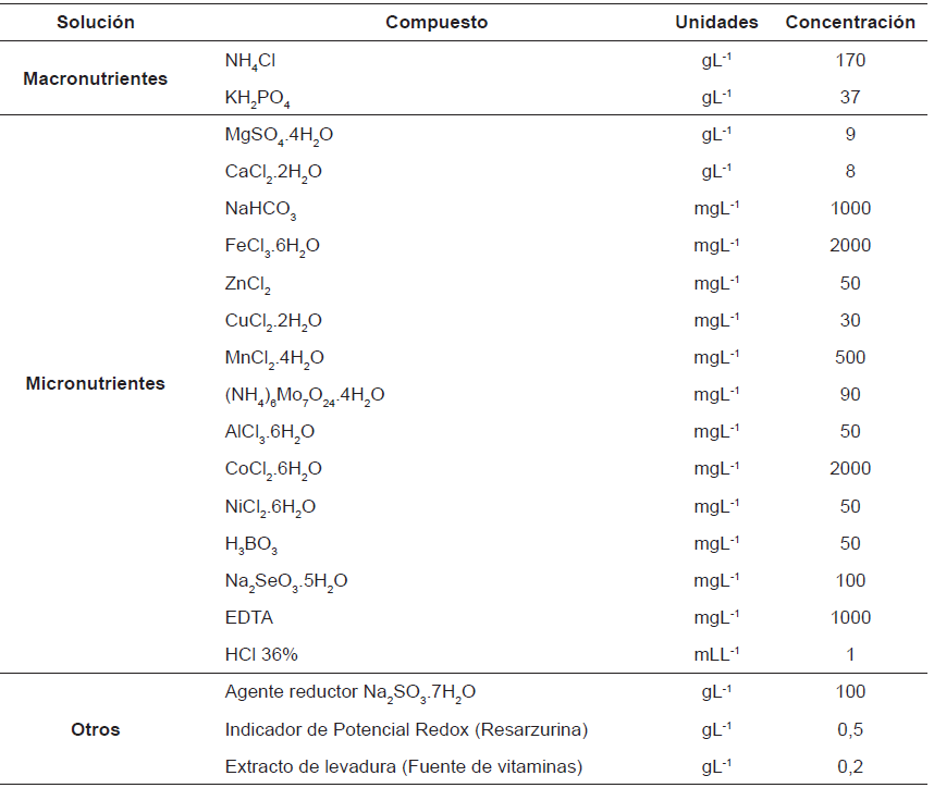 Solución de nutrientes: No hay un consenso en la literatura con relación a la solución de nutrientes que debe ser usada para el ensayo de PBM; sin embargo, existe una tendencia nacional e internacional de adicionarla al reactor [20]. En general, la solución está compuesta por macro y micronutrientes y otros compuestos como vitaminas, requeridos por los microorganismos anaerobios; adicionalmente, se agregan otras sustancias como un agente reductor, para garantizar condiciones anaerobias y algún indicador del potencial redox. En la Tabla 2 se presenta la solución de nutrientes recomendada para el ensayo de PBM.