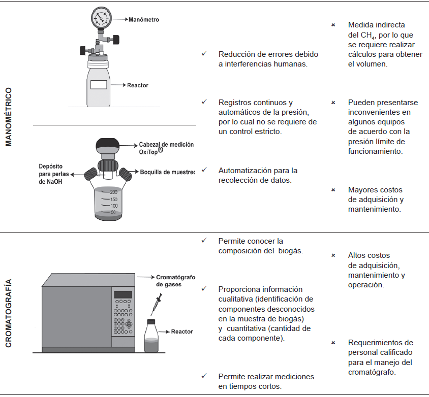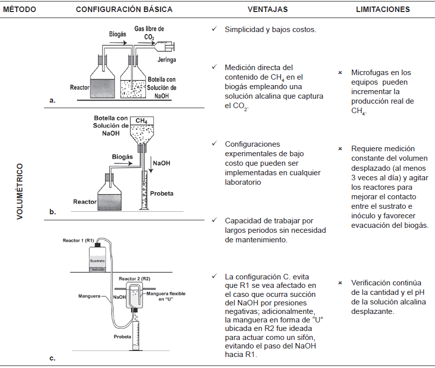 Los métodos volumétricos y manométricos son los más empleados en los ensayos de PBM [14]; dependiendo de la configuración, éstos miden el biogás generado en la DA, por lo que se requiere de la cromatografía de gases para determinar el CH4, mientras que en otros casos es posible medir el CH4 directamente como en el método volumétrico empleando una solución alcalina y en el manométrico capturando el CO2 antes de la lectura de la presión. En la Tabla 3 se presenta una recopilación de las configuraciones que se emplean generalmente en cada método y de las ventajas y limitaciones que presentan.
