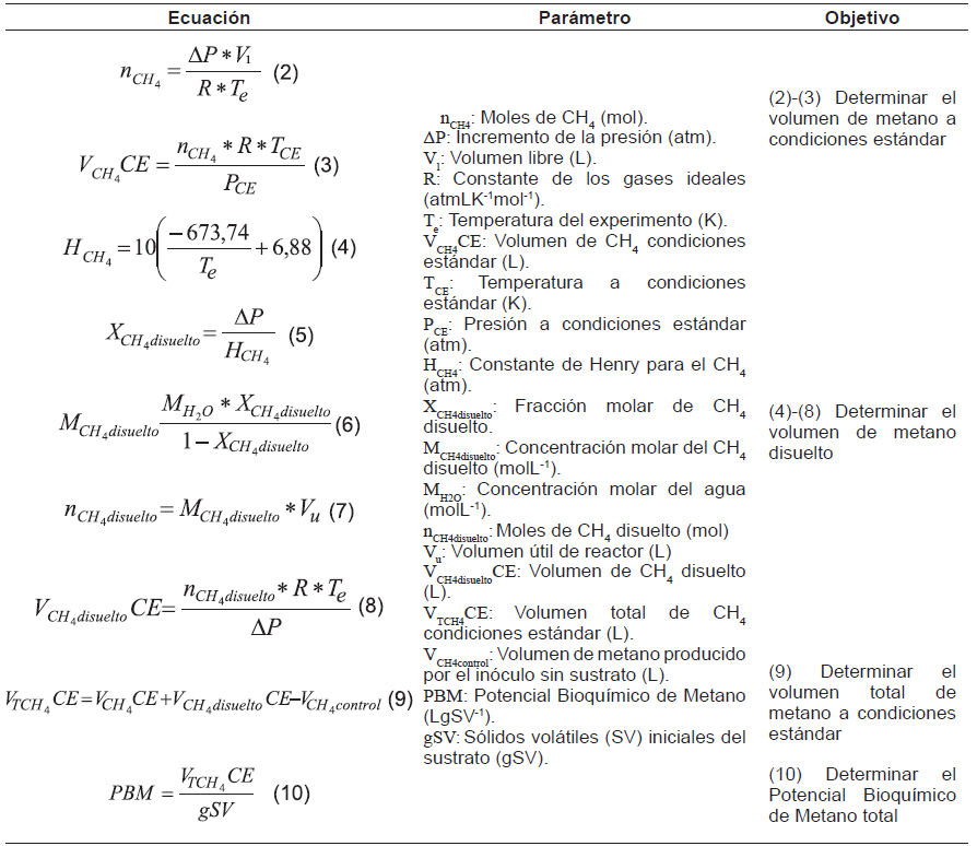 Para determinar el valor experimental del PBM, mediante los métodos volumétrico o manométrico, se requiere calcular el volumen de CH4 presente en el biogás, ya sea mediante la captura del CO2 o por cromatografía de gases. En el método manométrico la presión calculada se convierte a volumen empleando las ecuaciones que se presentan en la Tabla 4, las cuales no se encuentran reportadas de forma detallada, por lo que se recopilaron a partir de la revisión de diferentes estudios [20,30,42]. El valor del PBM se reporta a condiciones estándar de temperatura (273K) y presión (1atm) con el fin de permitir la comparación entre diferentes estudios.