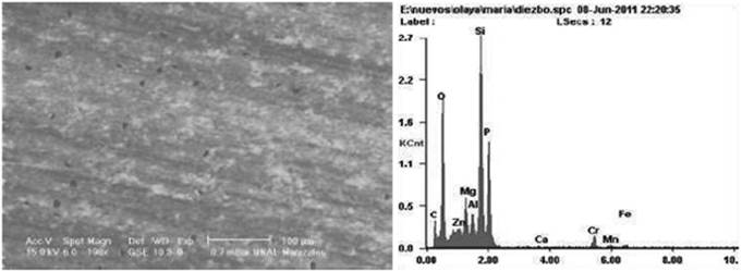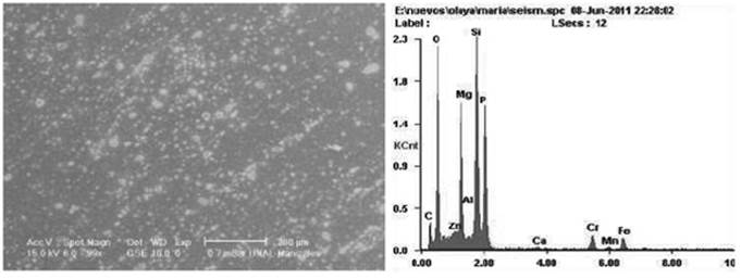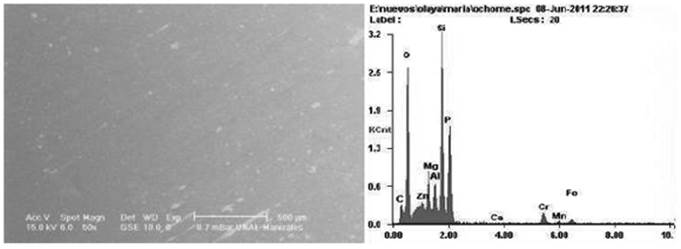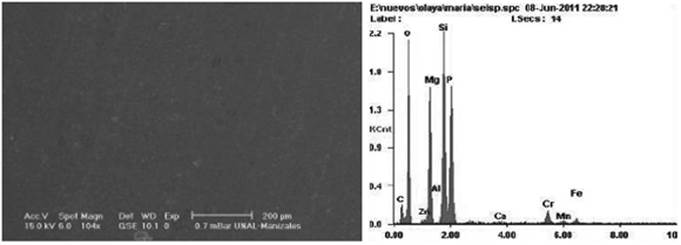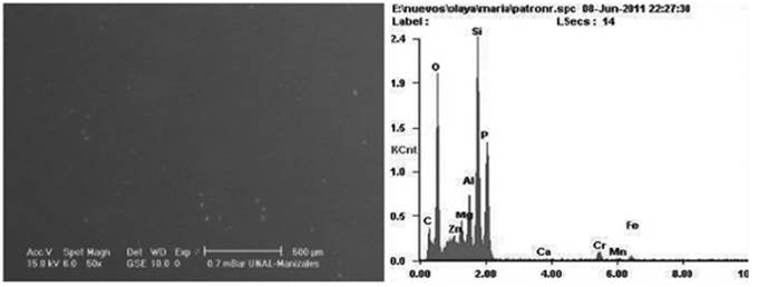 En la Figura 6 correspondiente a la muestra patrón, el silicio (Si) y el oxígeno (O) son los elementos de mayor incidencia, luego el fósforo (P) y aluminio (Al). La fotomicrografía no muestra alteraciones o presencia de “Inclusiones o impurezas”.