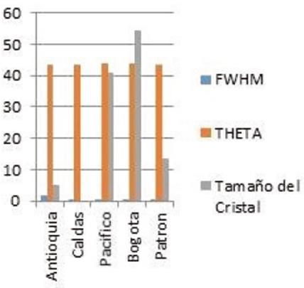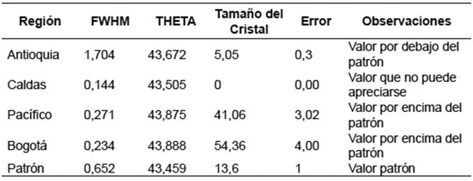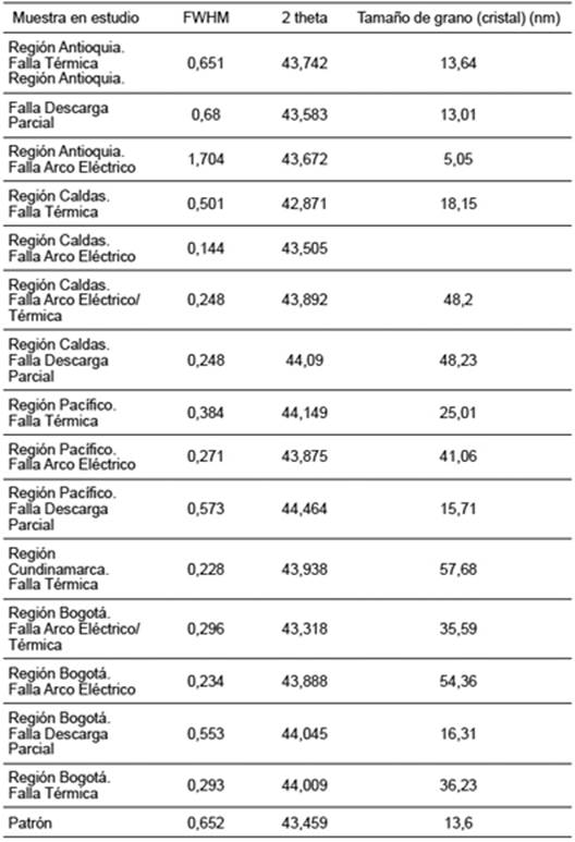 A continuación se muestran los resultados obtenidos de acuerdo a la región de procedencia de las muestras de equipos fallados aplicando la Ecuación 5 Debye-Scherrer , se determina el tamaño de grano (crystal size) cuyos resultados se muestran en la Tabla 3.