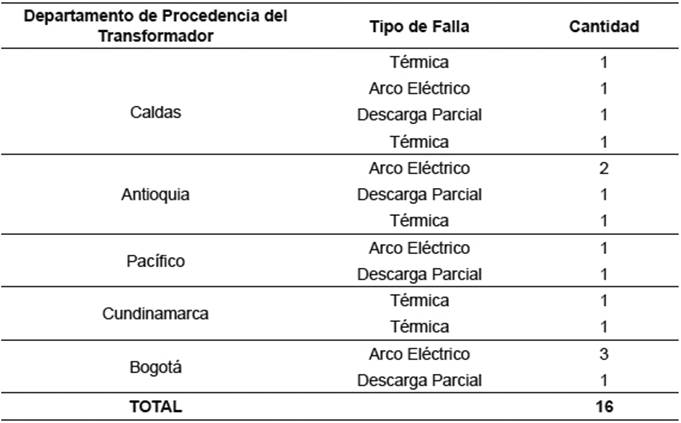 En la presente investigación se utilizaron restos de equipos fallados suministrados por la empresa colombiana FYR Ingenieros C.A, que se encarga de repararlos o fabricarlos. La Tabla 1 muestra cuarenta y siete (47) transformadores, de los cuales fueron seleccionados dieciséis (16) de acuerdo al tipo de falla por una parte, y por la otra, por cuestiones de costos para algunas pruebas experimentales, además de uno (01) que sirve de referencia para la muestra patrón. A continuación lo indicado: