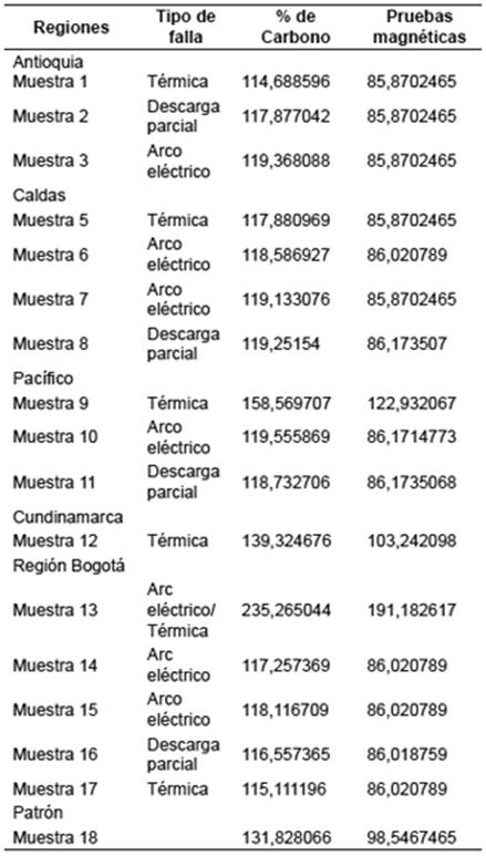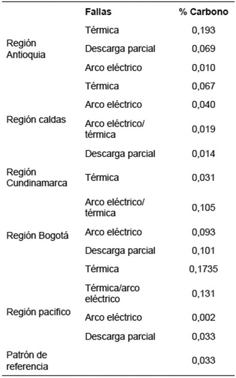 Los resultados obtenidos del análisis químico realizado con el Equipo Spectrovac, Marca Baird. De estos resultados se puede apreciar que hay cambios en el tamaño de grano en escala nanométrica en las regiones de Caldas, Pacífico, Cundinamarca y Bogotá con mayor incidencia debido a fallas térmicas o por arco eléctrico. Los