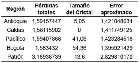 Todos los tamaños de cristal evaluados en la presente investigación procedentes de distintas regiones de Colombia, están fuera de los rangos establecidos, es decir, la falla por arco eléctrico “afecta esta condición del material”, independiente de la ubicación geográfica del transformador en estudio. La relación con el tamaño del cristal indicada en el Figura 8 es de suma importancia, porque las muestras procedentes de las Regiones de Bogotá y el Pacífico, presentan un tamaño muy grande en comparación con la muestra patrón, no siendo el caso de las procedentes de las Regiones de Antioquia y Caldas, cuyos tamaños son bastante reducidos, lo cual permite establecer que “la temperatura ambiente influye en los cambios que presenta la microestructura del material”.