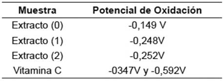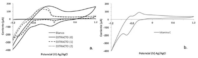 Los perfiles voltamperográficos de los diferentes extractos de espinaca mostraron potenciales de oxidación entre -0,252V y -0,149V; esto sugiere la presencia de al menos un compuesto antioxidante. La comparación de estos perfiles con el voltamperograma de vitamina C revela que los extractos de espinaca tienen una actividad antioxidante muy cercana al patrón de referencia.