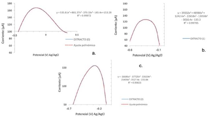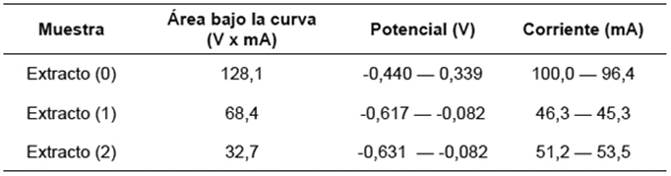Por otra parte, los voltamperogramas cíclicos de los extractos etanólicos de espinaca en solución Sørensen (Extractos en Figura 1a) evidencian potenciales característicos de soluciones con compuestos antioxidantes 20. El potencial de oxidación entre -0,590V y 0,339V, para la muestra fresca, i.e., extracto recién preparado (Extracto 0), sugiere la existencia de reacciones redox típicas de compuestos fenólicos; como antioxidantes 6. Los voltamperogramas de los extractos guardados durante 7 y 15 días (Extractos 1 y 2 en Figura 1a) muestran comportamientos semejantes: en ambos casos se observa un perfil similar a la primera muestra con respecto al potencial de oxidación.