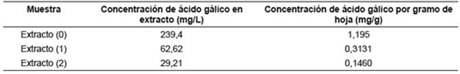 A partir de la curva de calibración del ácido gálico, identificado por el método Folin Ciocalteu, y las absorbancias de las muestras, medidas a 765nm, se estimó la concentración de los polifenoles totales de los extractos etanólicos (Tabla 3) en función de la cantidad de ácido gálico.