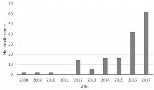La Figura 1 muestra la evolución del número de citaciones para artículos publicados por la Revista Ion según Google Scholar. En ella se observa un incremento exponencial de éstas pasando de 2 citaciones entre los años 2008-2010 a 62 citaciones en el 2017. Estos resultados van de la mano de del índice h (cuyo valor indica el número mínimo de artículos que han sido citados por lo menos el mismo número de veces) cuya evolución muestra que para el caso de la Revista se pasó de un índice h de 3 en el año 2008, a un h de 5 (según el programa Publish or Perish). Esto muestra una mejoría en la confianza dada por los científicos a utilizar resultados obtenidos por pares que en han publicado en la revista, en temáticas de actualidad para los investigadores, esencialmente en esta parte del continente.
