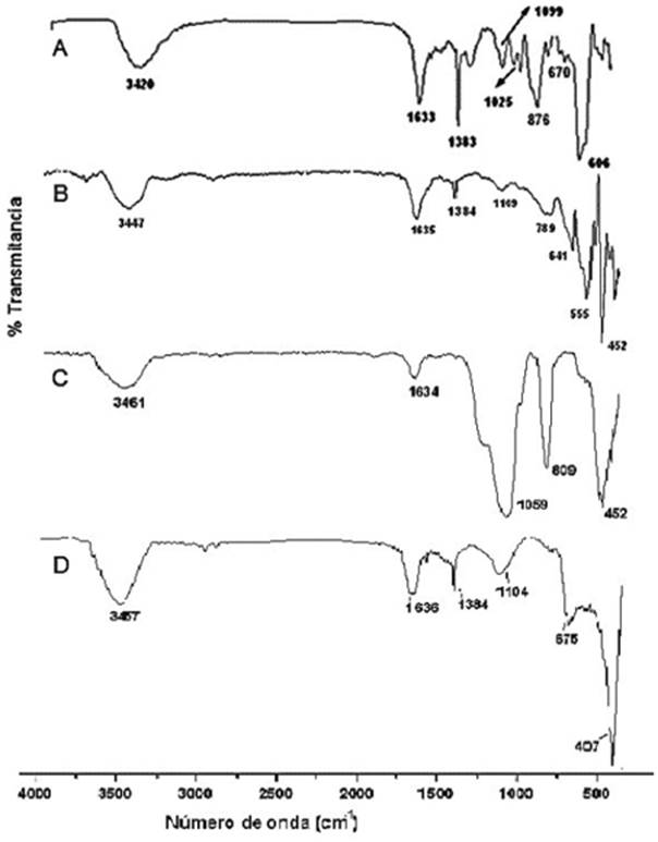 En todos los infrarrojos se observa una banda a 3400cm-1, la cual se pueden atribuir a la vibración del enlace O-H de los grupos hidroxilos. Adicionalmente para el óxido de zinc (Figura 1a), el scissoring del grupo O-H se observa a 669cm-1. La absorción a 874cm-1 es debida a la formación de una coordinación tetraédrica del Zn. El pico a 604cm-1 indica el estiramiento del enlace Zn-O. En lo que respecta al Al2O3 (Figura 1b), aparecen las bandas asociadas al enlace Al-O del Al2O3 las cuales se encuentran alrededor de 554cm-1 y 456 cm-1. Para el caso del SiO2 (Figura 1c), se aprecia la banda de absorción cercana a 1105cm-1 que corresponde a la vibración del enlace Si-O, la banda a 468cm-1, se puede atribuir a las deformaciones del enlace Si-O-Si pertenecientes al SiO2. Para el caso del óxido de magnesio, a 422cm-1 se aprecia la banda característica del enlace Mg=O.