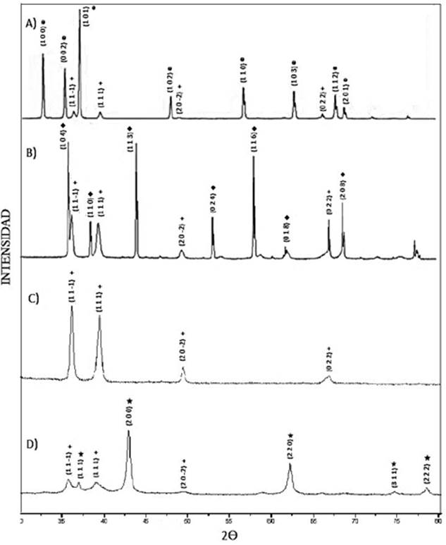 Es importante mencionar que la intensidad de los picos de difracción del Cu2+ representa la cuenta de cada uno de los planos presentes en proporción a la cantidad de cristal puro formado y en el Cu20%/ ZnO, (Figura 2A), se observa que la intensidad disminuye posiblemente por un alto contenido de especies interferentes correspondiente a los nitratos (NO3 -), restándole disponibilidad a los dos planos (1 1 -1) y (1 1 1) del CuO, mientras que en el Cu20%/Al2O3, la intensidad de los picos de difracción del Cu2+ es mayor debido a la menor presencia de nitratos, que permiten una mayor disponibilidad de los planos anteriormente mencionados.