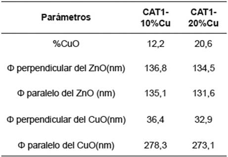 Por otra parte, la composición de la tenorita CuO, así como el diámetro perpendicular y paralelo de los cristalitos de las especies caracterizadas se reportan en la Tabla 1.