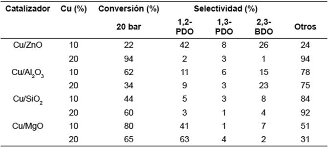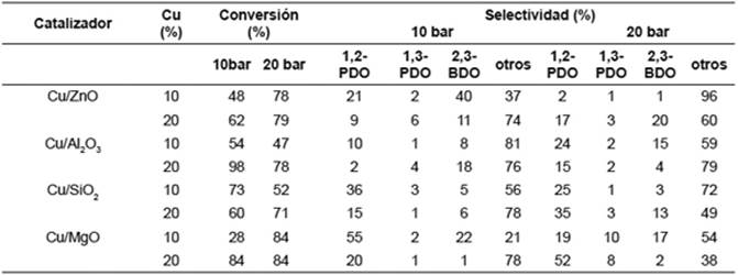 En la Tabla 3 se presenta la conversión del glicerol y la selectividad hacia los productos de reacción a presiones de 10 y 20bar, a 473K de reacción y activados a 573K.