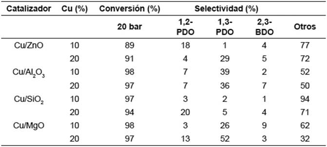 Catalizadores de Cu soportado en óxidos básicos como: MgO, CaO, CeO 7,8,9, anfóteros como: ZnO 1,2,3,4,7,8,9,10 y ácidos como: SiO2, MCM41, ZrO2, TiO2, Al2O3 3,11,12, demuestran que un buen equilibrio entre la fase metálica de Cu y la fase del soporte, mejoran la conversión y favorecen el rompimiento de enlaces C-O contribuyendo a la selectividad hacía el 1,2-propanodiol 13. Dentro de los productos encontrados aplicando estos catalizadores heterogéneos, se tiene principalmente: acetol y propilenglicol, por otra parte se encuentran productos secundarios como metanol, etanol y propanol, demostrando que la aplicación de los catalizadores heterogéneos conlleva a rompimientos entre enlaces C-C (13, 14).