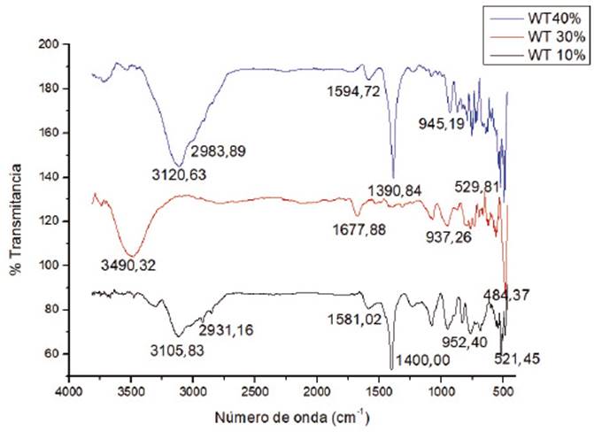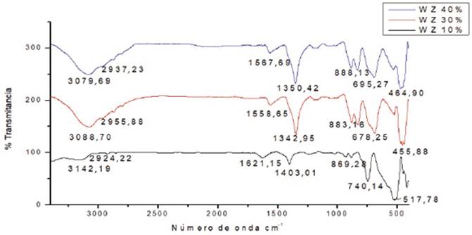 Los exámenes IR muestran bandas de tensión que aumentaron en intensidad con el aumento de la carga másica de tungsteno empleada. El aumento de la carga conduce a un aumento en la densidad superficial de tungsteno como se indica en la Tabla 1. La densidad superficial permite considerar el nivel de recubrimiento de los óxidos soporte (valores de monocapa) y las estructuras superficiales que se encuentran en los catalizadores; con base en lo cual se identificó al trióxido de tungsteno (WO3) como la estructura soportada sobre los óxidos correspondientes 21. Igualmente, se observa la presencia de bandas de tensión del enlace W=O (1010-910cm-1) y de bandas de tensión del ion tetraédrico [WO4 ] 4- (668,25-793,12cm-1). Ambas bandas son más intensas cuando las densidades superficiales de tungsteno sobrepasan los valores de monocapa (Tabla 1), que fueron constatados con base en la literatura 13,19,22.