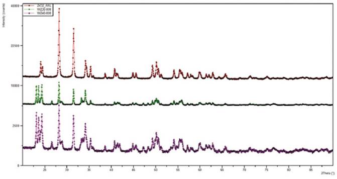 En lo que concierne al estudio por difracción de rayos X (DRX), los difractogramas de los sistemas WO3/ZrO2, se muestran en la Figura 3. El óxido ZrO2 presentó un grupo espacial P121/c1, que lo clasifica como una celda monoclínica primitiva con parámetros de celda a = 5,1472 ± 0,0001Å, b = 5,2085 ± 0,0001Å y c = 5,3134 ± 0,0001Å. El volumen de celda correspondiente es igual a 142Å3. La celda tiene una densidad másica de 6,009g/cm3 y un peso por fórmula igual a 508,866uma. El tamaño de cristalito perpendicular obtenido es 63,267nm, mientras que el tamaño de cristalito paralelo es 67,48nm, indicando que los cristalitos son ligeramente alargados. Los picos representativos de esta fase se encuentran a valores de 2θ iguales a 28,1° y 31,4°, respectivamente. Todos los catalizadores a base de ZrO2 de diferente concentración en WO3 presentaron estructuras cristalinas pertenecientes a fases monoclínicas de WO3 libre, las cuales se incrementan en intensidad al aumentar la carga empleada, confirmando así la presencia de la especie de paratungstato a la que pertenecen las bandas observadas en el FT-IR. Para la carga másica de tungsteno de 30%, solamente se observa la especie Na2WO4 y los tres parámetros de celda son idénticos e iguales a 9,1307 ± 0,0001Å. El volumen de celda correspondiente es igual a 761,215Å3, mientras que el tamaño de cristalito perpendicular es 233,96nm y el tamaño de cristalito paralelo es 122,64nm, indicando que los cristalitos son achatados. En lo que respecta al ZrO2 en el sistema con una carga másica de tungsteno de 40%, el tamaño de cristalito perpendicular aumenta de 63,267nm a 78,38nm y el tamaño de cristalito paralelo aumenta de 67,48nm a 79,04nm, de modo que los cristalitos son prácticamente esféricos. Se observó una leve transición de fase en el soporte al encontrarse picos de la fase tetragonal del soporte ZrO2, para valores de 2θ iguales a 29,5° y 35,4°, los cuales coexisten a temperatura ambiente gracias a la estabilización generada por la especie de tungsteno. Sin embargo, la transición de fase en este soporte es muy baja (menor al 8% en peso) en comparación con la observada en otros estudios 10,23. Esto podría mejorarse al emplear un hidróxido amorfo de zirconio, por ejemplo, Zr(OH)4, debido a que es más fácil modificar su estructura cristalina por medio de la impregnación y consecuente calcinación.
