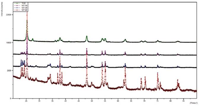 Los patrones DRX refinados de los sistemas WO3/TiO2 [10%W] (Figura 4) indicaron que la proporción en peso de las fases en el sistema WO3/TiO2 es 9%/91%. Además, se encuentra presente la fase Na2WO4 que pertenece al grupo espacial Fd-3m, siendo una estructura cúbica centrada en las caras, con parámetros de celda a = b = c = 9,1329 ± 0,0001Å y con un volumen de celda unitaria igual a 761,780Å3. Para esta fase, los tamaños de cristalito perpendicular y paralelo son 164,50 y 144,57nm, respectivamente. En lo que respecta al TiO2, se observó una transición de fase completa en el óxido soporte, puesto que la fase rutilo desapareció y para la fase anatasa presente, los tamaños de cristalito perpendicular y paralelo se incrementaron considerablemente al pasar de 30,25 y 25,41nm a 128,17 y 128,17nm, respectivamente, de modo que los cristalitos resultan ser esféricos. Para el WO3, la fase presente es la Na2WO4. Por otro lado, al incrementar la carga másica de tungsteno a 40% se produjo la aparición de una nueva fase, H4Na2WO6, que pertenece al grupo espacial Pbca, siendo el sistema cristalino el de una celda primitiva ortorrómbica y con parámetros de celda a = 8,4848 ± 0,0001Å, b = 10,5952 ± 0,0018Å y c = 13,8582Å. El volumen de la celda unitaria es igual a 1245,814Å3. Finalmente, los tamaños de cristalito perpendicular y paralelo son 712,98 y 1066,69nm, respectivamente.