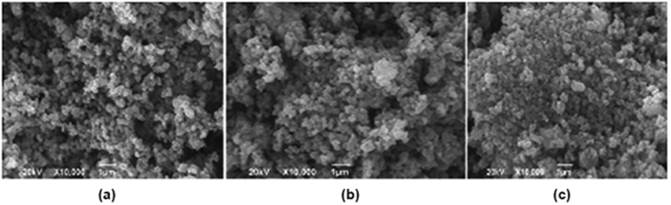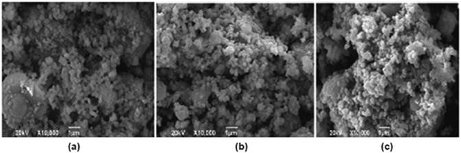 Con base en estudios previos realizados por Chu et al.15, es deseable tener una mayor presencia de una estructura cristalina del óxido soporte en fase tetragonal acompañada por cristales monoclínicos de la especie WO3, ya que se considera que la interacción de los cristales WO3 con la fase tetragonal del óxido genera cambios electrónicos responsables de la actividad catalítica en reacciones de hidratación directa del etileno en fase gaseosa 14,16,24. Los catalizadores fueron evaluados mediante microscopia electrónica de barrido (SEM/EDS). La Figura 5 revela para los sistemas WO3/ZrO2 un mayor agrupamiento molecular de cristalitos irregulares con tamaño micrométrico a medida que se aumenta la carga empleada en el óxido de zirconio. Por otra parte, la Figura 6 muestra que para el sólido WO3/TiO2, el aumento en la carga másica de tungsteno en el soporte de óxido de titanio favoreció la formación de nanocristalitos esféricos con un menor espaciamiento intermolecular 25.