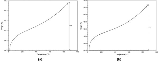Los experimentos de análisis termogravimétrico (TGA) que se llevaron a cabo bajo una corriente de oxígeno, tuvieron como propósito estudiar la estabilidad térmica de los compuestos luego de la calcinación realizada (Figuras 7 y 8). Todos los compuestos sintetizados son térmicamente estables hasta temperaturas de 500°C. Las curvas observadas en todos los catalizadores presentan un comportamiento característico de la oxidación superficial debido al incremento de peso registrado en los exámenes 26. Se registraron incrementos hasta del 1% en peso en muestras soportadas en ZrO2 a medida que se aumentó la carga empleada del WO3. Para las muestras soportadas en TiO2 se encontraron incrementos hasta del 3% en peso. Esto concuerda con los resultados encontrados por el método DRX en donde se puede observar una mayor presencia de la fase tetragonal en el soporte, aumentándose así su estabilidad térmica.