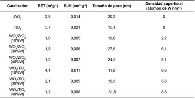Los análisis realizados indican que los catalizadores sintetizados son sólidos térmicamente estables en los cuales el óxido de tungsteno (WO3) es la especie impregnada en ambos óxidos de soporte; sin embargo, el WO3 se encuentra mejor asociado con el soporte de TiO2, al presentar el TiO2 una mayor transición de fases (monoclínico a tetragonal) permitiendo que los catalizadores WO3/ TiO2 mantengan una elevada área superficial en comparación con los catalizadores cuyo soporte es el ZrO2, tanto para valores bajos de densidad superficial como para valores en los que se excede la monocapa.