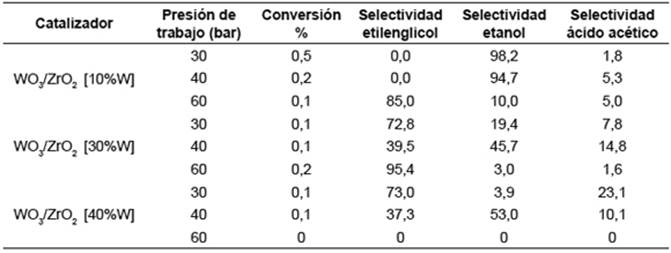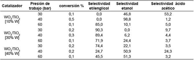 Por otra parte, en la Tabla 3 se indican los resultados obtenidos en el estudio exploratorio al emplear los catalizadores WO3/TiO2. Se observa que el catalizador con el 10% en peso de tungsteno y a una presión de 40bar presenta los mayores valores de conversión (0,5%) y de selectividad (98,8%). Como ocurre también para los catalizadores WO3/ZrO2, para los catalizadores WO3/TiO2 se obtuvieron valores de densidad superficial iguales o superiores a la monocapa. La conversión del etileno no se incrementa al cambiar el catalizador de WO3/ZrO2 a WO3/TiO2 y además se observa la aparición de un subproducto inesperado (etilenglicol), lo cual genera una disminución de la selectividad hacia etanol en la reacción.