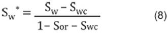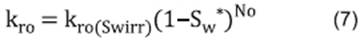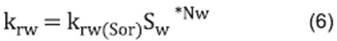 Krw (Sor) = Permeabilidad relativa del agua a condiciones de saturación de aceite residual, mD Kro (Swirr)= Permeabilidad relativa del aceite a condiciones de saturación de agua irreducible, mD Sw= Saturación de agua, adimensional