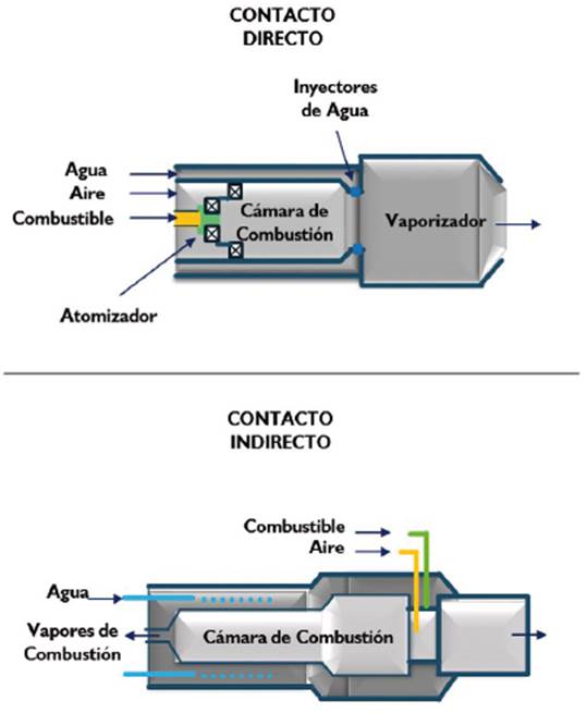 Generadores de combustión de contacto indirecto. Tienen un funcionamiento similar a los generadores de combustión de contacto directo; su diferencia radica en que los gases de combustión no se mezclan con el vapor, puesto que los primeros retornan a superficie por medio de una tubería.