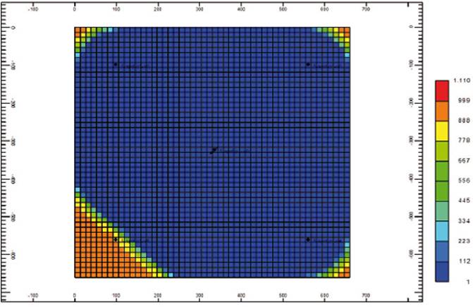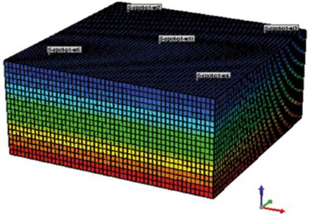 Para la creación del modelo se escogió un grid cartesiano tridimensional con un tamaño de 10 acres, discretizado en 50 celdas en la dirección i y j, y 18 celdas en la dirección k.