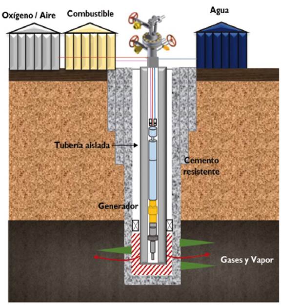 Generadores de combustión de contacto directo. Son herramientas tubulares cuyo ensamblaje consta de un atomizador, el cual controla la cantidad de combustible que entra, con el fin de minimizar el tiempo de combustión; un quemador, situado en el extremo superior de la herramienta, donde el aire es debidamente mezclado con las gotas de combustible para generar una reacción de combustión estable que calentará el agua que se inyecta desde las paredes laterales de la cámara y se pone en contacto con los gases y la llama que sale del quemador; un mezclador, donde el agua se combina uniformemente con los productos de la combustión, y un vaporizador, cuya función es proporcionar un tiempo de residencia suficiente para alcanzar la evaporación completa del agua 8. La característica más representativa de esta clase de generadores es que los gases de combustión se mezclan con el vapor que va a ser inyectado a la formación y salen por el extremo inferior de la herramienta que se encuentra abierto.