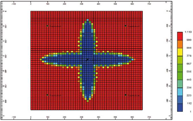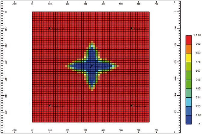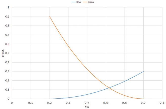 La construcción de las curvas de permeabilidad relativa se realizó con end points a través de la correlación de Hirasaki, mostrada en las Ecuaciones 6 y 7. En la Figura 4 se muestra la gráfica de permeabilidad relativa agua - aceite, la cual describirá el movimiento de los fluidos en el medio poroso y en la que se distingue un sistema mojado por agua. Para la configuración de los pozos, se utilizó un arreglo de cinco puntos invertidos, como se muestra en la Figura 5, que encierra un área de 5 acres. El constraint usado para este tipo de pozos fue una BHP (bottom hole pressure) de 200psi.