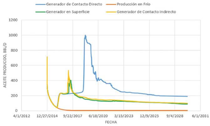 En la gráfica ilustrada en la Figura 6, se aprecia un aumento considerable en la producción de aceite, cuando se usa un DSG de contacto directo, con una respuesta casi inmediata, comprobando que sí hay un efecto favorable de los gases de combustión sobre el aceite in situ.