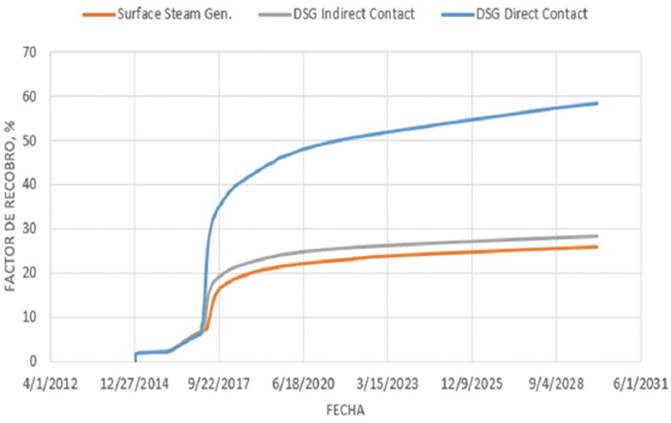 La Figura 7 muestra las curvas del factor de recobro, relacionadas directamente con las curvas de aceite producido; en éstas se puede apreciar que no hay una diferencia representativa entre la curva de un DSG de contacto indirecto con una calidad de 85%, y un generador ubicado en superficie con calidad de 60%; si el modelo conceptual tuviese una profundidad mayor a la limitante en un proceso de vapor, habría una diferencia más significativa debido a las pérdidas de calor en pozo; el mayor factor de recobro se alcanza con un DSG de contacto directo, llegando a valores de 63%. A pesar de que el gas no condensable que se encontraba en mayor proporción era el nitrógeno, caracterizado por sus altos valores de PMM, se graficó el cambio de la viscosidad del aceite para el caso de un generador de vapor de contacto directo con comburente aire, y un generador de vapor de contacto indirecto, con el fin de determinar la existencia de miscibilidad gracias al cambio de viscosidad y corroborar el efecto de los gases de combustión.