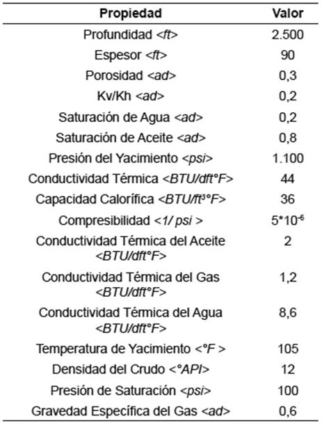 El modelo es totalmente homogéneo, y presenta un espesor de arena neto de 90 ft. Las propiedades petrofísicas se muestran en la Tabla 1, al igual que las propiedades térmicas de la roca y los fluidos del modelo, ya que se representará un proceso térmico de inyección continua de vapor 14. En cuanto a las propiedades de los fluidos del yacimiento, se creó un PVT (presión, volumen específico y temperatura) sintético con valores característicos de un aceite negro, las cuales también se muestran en la Tabla 1.