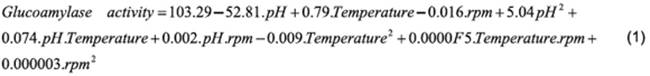 The polynomial obtained for glucoamylase activity (Equation 1) showed an R-squared value of 89.1% and an adjusted R-squared value of 87.7%, which could explain the variability in enzymatic activity with a standard error of 0.4% and an absolute error of 0.3%.