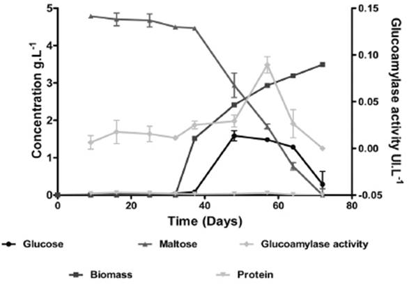From samples of sour cassava, it was possible to obtain 13 fungal isolations belonging to the genera Fusarium, Penicillum, Geotrichum, Scopularipsis and Aspergillus, and all the isolations showed saccharolytic activity. The two isolations with the best volumetric productivity were Aspergillus A1 and Aspergillus A12 with 0.07 and 0.05gL-1, respectively. The isolation that showed the best production of glucose from maltose was Aspergillus A1 (1.3gL-1) between 50 and 60 hours of fermentation. This agrees with the highest volumetric enzymatic activity from extract obtained at the same time, despite a low protein concentration, as shown in Figure 1. Based on the volumetric activity, glucose production from maltose hydrolysis was confirmed in all fungal isolations, with the fungi of genera Aspergillus having the best productivity. The previous results confirm that the Aspergillus genus had the highest glucose syrup production by submerged fermentation 17,18. Authors such as Riaz et al19. and O’Brien et al20, have suggested several species of Aspergillus, including A. awamori, A. foetidus, A. niger, A. oryzae, A. terreus, for glucose syrups obtaining from polysaccharides.
