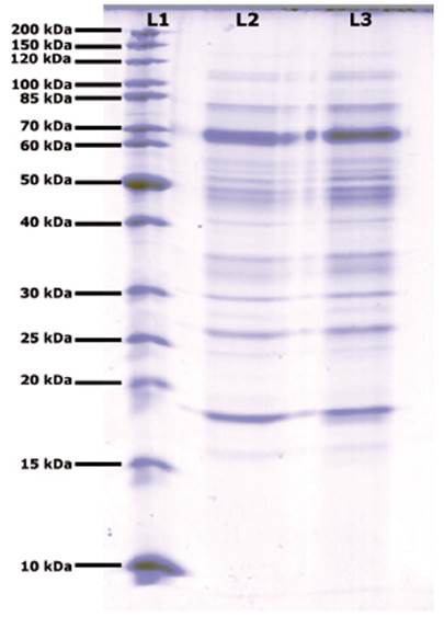 Electrophoresis SDS-PAGE was performed on enzymatic extracts obtained by SSF of Aspergillus A1 to determine the molecular weight of the proteins present in the extract. A Fermentas PageRuler of 10 to 200kDa was used as a molecular weight standard. Samples were run at 120 volts in 12% polyacrylamide gels using Coomassie blue as the dye.