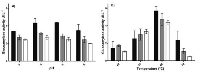 The highest values of enzymatic activity and glucose obtained from maltose were at pH 4 (4.4UI.mg-1 and 6,8µmolmL-1, respectively) and a temperature of 60°C (5.6UI.mg-1 and 3.5µmol.mL-1, respectively), as shown in Figure 3.