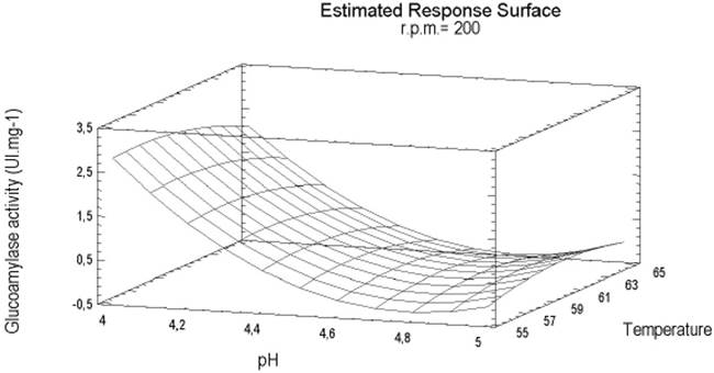 Analysis of variance showed that the best saccharolytic activity of the extract at pH values between 4 and 5, agitation between 200 and 600rpm and a temperature of 60°C. By using these values, it was possible to define the variables for the experimental design matrix.