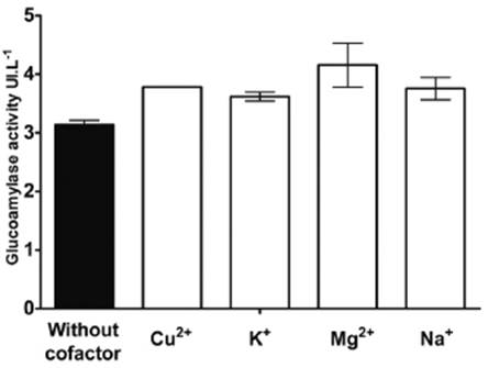 Enzymatic cofactor evaluation showed that all cofactors evaluated had a positive influence on enzymatic activity. The Mg2+ ion was found to increase enzymatic activity by 32%, resulting in a value of 4.15UI.mg-1. Figure 5 shows that the use of metallic ions such as enzymatic cofactors increases enzymatic activity compared to the control. Mg+ was the most influential factor, resulting in a 32.4% increase in enzymatic activity. This result agrees with that reported by Bhatti et al 15 and Benassi et al 26, who found a 176% increase in enzymatic activity using manganese ions in glucoamylase from Fusarium phoenicis.