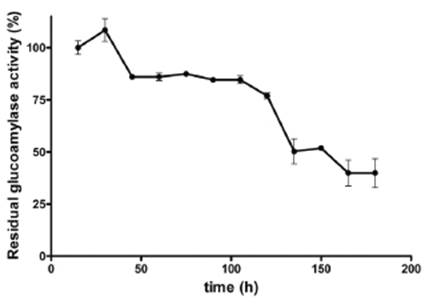 The half-life determined for the enzymatic extract from Aspergillus A1 was 60 minutes of incubation at 60°C, which was a similar time to that obtained by Sutthirak et al27, who determined that the greatest decrease in enzyme activity occurred after two hours (Figure 6).