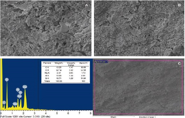 El lodo seco, tomado de la PTAR de Sotaquirá, analizado por el microscopio electrónico de barrido, presenta una estructura amorfa con presencia de agregados propios de arenas, limos y arcillas. En la figura 1, se observa la microestructura del lodo a dos aumentos, 10.000 X y 5.000 X y el espectro EDS, el cual indicó la presencia de un alto contenido de oxígeno (57,91) y carbono (19,61), presencia de silicio (11,84), aluminio (8,91) y magnesio (1,73) que corresponden a porcentajes atómicos. Se encontró que el oxígeno es el elemento con mayor porcentaje, debido a la presencia de minerales de óxido. El contenido de silicio y aluminio se podría originar de minerales de silicato y aluminosilicatos [22]. El contenido de carbono es debido a la materia orgánica presente en el lodo, debido a microorganismos durante el almacenamiento de la muestra; y la presencia de magnesio se puede asociar a la capacidad de intercambio de cationes.