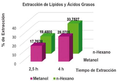 El porcentaje de extracción de lípidos y ácidos grasos es mayor usando como solvente n-hexano, a un tiempo de extracción de 4 horas, en comparación con los lípidos extraídos con el metanol, lo que indica que los ácidos grasos son de tipo apolar y polar.