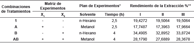 La extracción de lípidos y ácidos grasos se efectuó por el método estándar SM5520E [15], con algunas modificaciones, usando como solventes n-hexano C6H14 y metanol CH3OH (grado analítico, Merck) a dos tiempos de extracción 2,5 y 4 horas. Para el estudio se planteó un diseño experimental correspondiente a un diseño factorial 22 para determinar si los tratamientos difieren significativamente en la extracción de lípidos a partir de lodos de PTAR. En la tabla 1, se presentan las combinaciones de los tratamientos, la matriz y el plan de experimentos y el rendimiento de la extracción. La cantidad de muestras a tratar fueron 4, razón por la cual se planteó el tratamiento de los datos por medio de un diseño factorial 2k. Donde el efecto se denotó con letra mayúscula "A" y "B", la interacción de los dos efectos con AB y las combinaciones de los tratamientos se designaron con letras minúsculas (tabla 1). Este diseño es el más sencillo y es representado por un cuadrado [16].