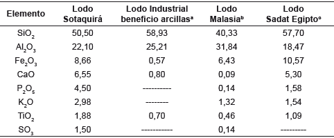 Estos lodos, con un tratamiento adecuado, pueden ser usados en zonas verdes, tales como separadores viales, campos de golf y lotes vacíos; como producto para uso en áreas privadas (jardines, antejardines, patios, plantas ornamentales y arborización), en agricultura y plantaciones forestales; como insumos en procesos de elaboración de abonos o fertilizantes orgánicos, para remediación de suelos contaminados, como insumo en la fabricación de materiales de construcción, en la estabilización de taludes de proyectos de la red vial nacional, red vial secundaria o terciaria, en actividades de revegetalización y paisajismo de escombreras y, en procesos de valorización energética [20]. Los principales constituyentes del lodo primario incluyen silicio, aluminio, hierro, calcio, entre otros. En la tabla 4, se muestran los componentes de minerales determinados por fluorescencia de rayos X, en comparación con los minerales constituyentes de lodos de una industria de beneficio de arcillas [21], de la PTAR de Sungai Dua Penang en Malaysia [22] y de la PTAR de Sadat Minufiya en Egipto [23]. La composición del lodo de Sotaquirá muestra un alto contenido de óxido de silicio (SiO2) seguido de óxido de aluminio (Al2O3), con algunos óxidos inorgánicos en menor proporción. Los contenidos de óxidos de silicio y de aluminio se presentan en mayor proporción, debido a que son constituyentes principales en el suelo natural. La presencia de óxido de aluminio (Al2O3) en los lodos también se debe a los coagulantes usados dentro del tratamiento de aguas. El óxido de hierro (Fe2O3), además de ser un constituyente del suelo natural, puede ocasionar el color naranja en lodos en grandes cantidades [22]. P2O5, K2O y el SO3 son macronutrientes del suelo necesarios para el crecimiento de las plantas. El TiO2 ayuda a la aceleración de reacciones provocadas por la luz.
