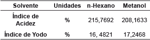 La tabla 5 muestra los valores de índice de acidez y yodo de los lípidos obtenidos con n-hexano y metanol. El valor de índice de acidez es alto para los dos solventes, lo que indica que el extracto contiene una elevada cantidad de ácidos grasos libres, la cual es inconveniente en la producción de biodiésel por dos factores. En primer lugar, se pueden presentar reacciones de saponificación (producción de jabón) durante la transestirificación, para lo cual es necesario hacer primero una esterificación donde se conviertan la gran mayoría de ácidos grasos libres en ésteres. En segundo lugar, la presencia de ácidos grasos libres, junto con un alto contenido de agua, facilitan las condiciones de hidrólisis, disminuyendo el rendimiento de la producción y la cantidad de biodiesel obtenido [28]. El índice de yodo para la extracción con n-hexano y metanol es bajo, con respecto a estudios realizados de aceites de cocina desechados, usados y frescos [29], así como extracciones de lípidos a partir de microalgas [30], lo que sugiere una menor proporción de enlaces insaturados.